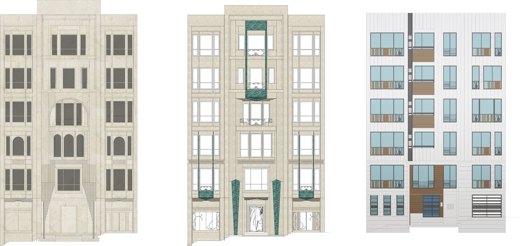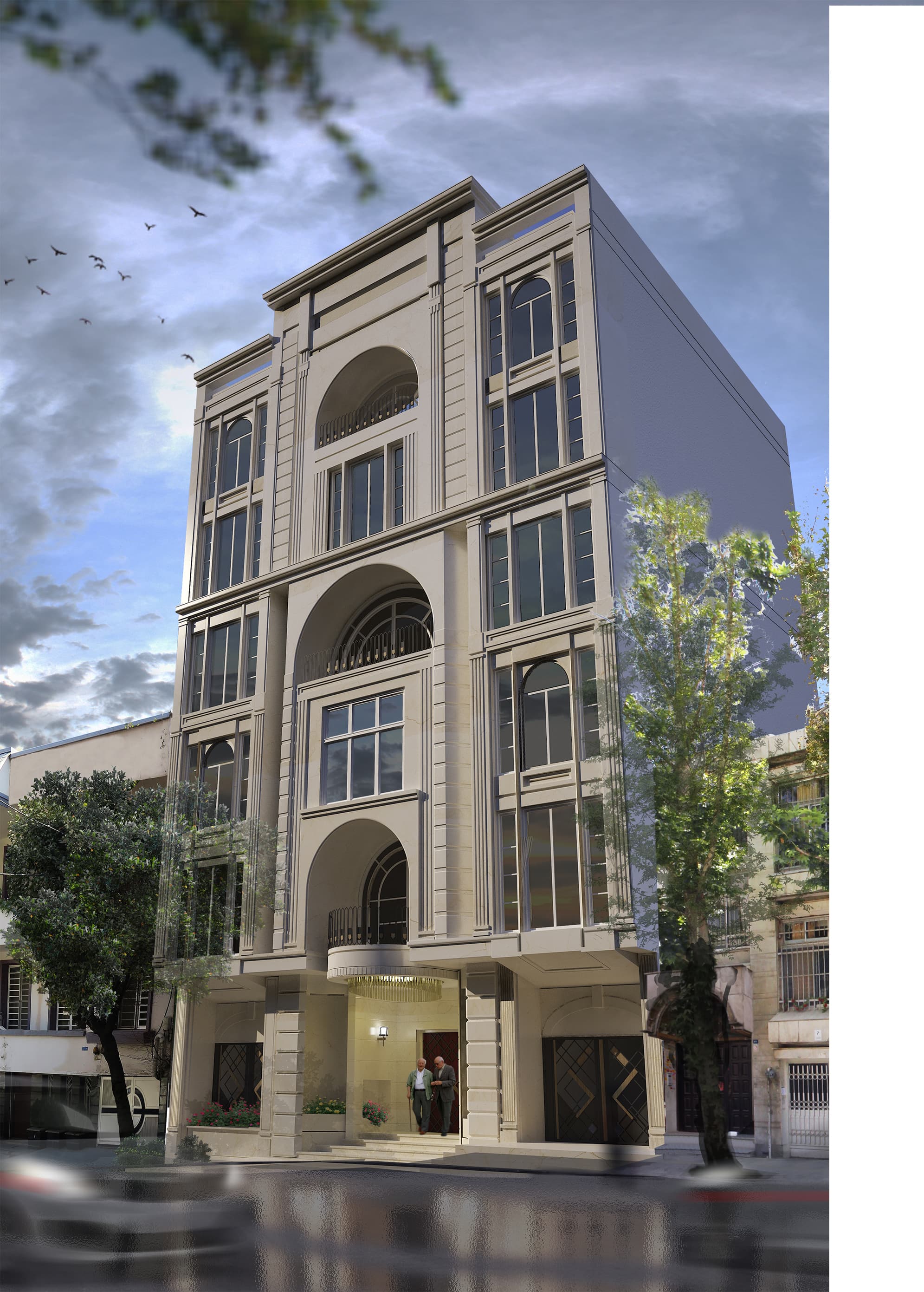 This building embodies the confluence of timeless design and urban functionality, where classical inspiration meets the demands of modern city living. Rooted in neoclassical architecture, its symmetrical façade, defined by soaring arches and meticulous detailing, conveys an enduring sense of grandeur and sophistication